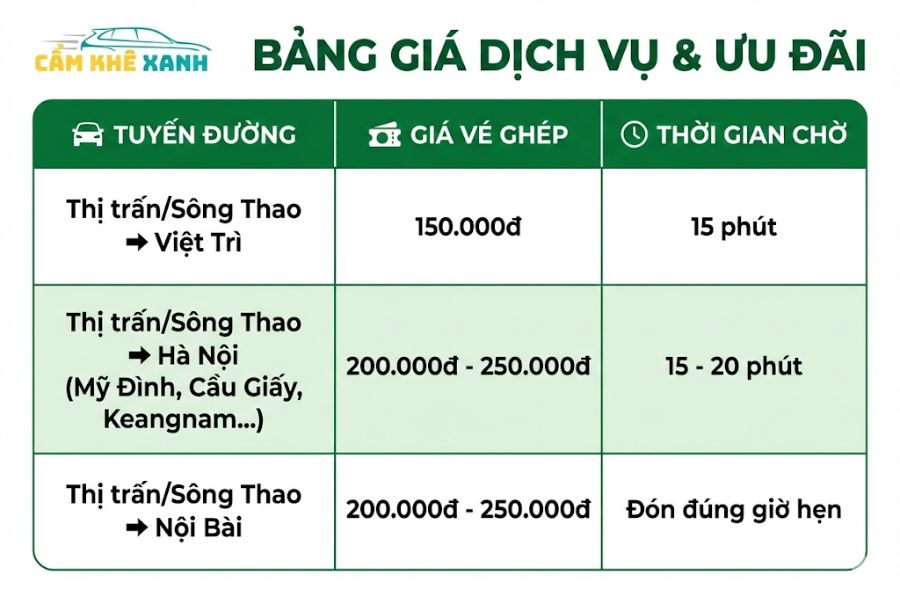 2. Bảng giá vé xe ghép xã Phú Khê đi Hà Nội, Việt Trì